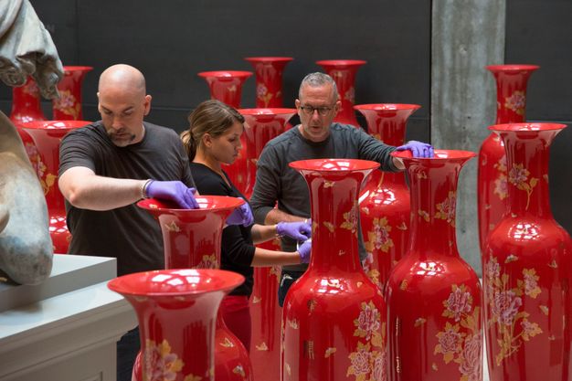 Twomey sometimes describes herself as a “post-studio” artist. Though a specialist in ceramics, she rarely touches wet clay herself, instead asking others to execute her ideas. This also applies to the installation of Made in China at Yale, which was quite literally the work of many hands. For a visitor, the vases may seem to have appeared by magic, but in fact, the museum’s crew devoted the better part of a week to the installation. This was highly skilled, delicate work. As each vase was carefully positioned, it was carried by teams of two, fixed in place with wax, and then weighted to prevent tipping. Ingeniously, the art handlers devised a bespoke system involving strings of small handmade sandbags, which could be dropped down the neck (a single solid weight would have been very difficult to remove at the conclusion of the installation). It is important to recognize this professional labour, which mirrors that of the Chinese fabricators, who created the vases.
